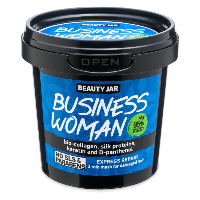 Beauty Jar Hair Mask – Business Woman. Express repair. Bio-collagen, silk proteins, keratin and D-panthenol: Bio collagen strengthens the hair and retains moisture. Keratin restores the strength and shine even to the dullest hair. Silk proteins restore hair structure, making them smooth and silky. D-panthenol covers every hair with a light film, protecting from bad weather and heat styling